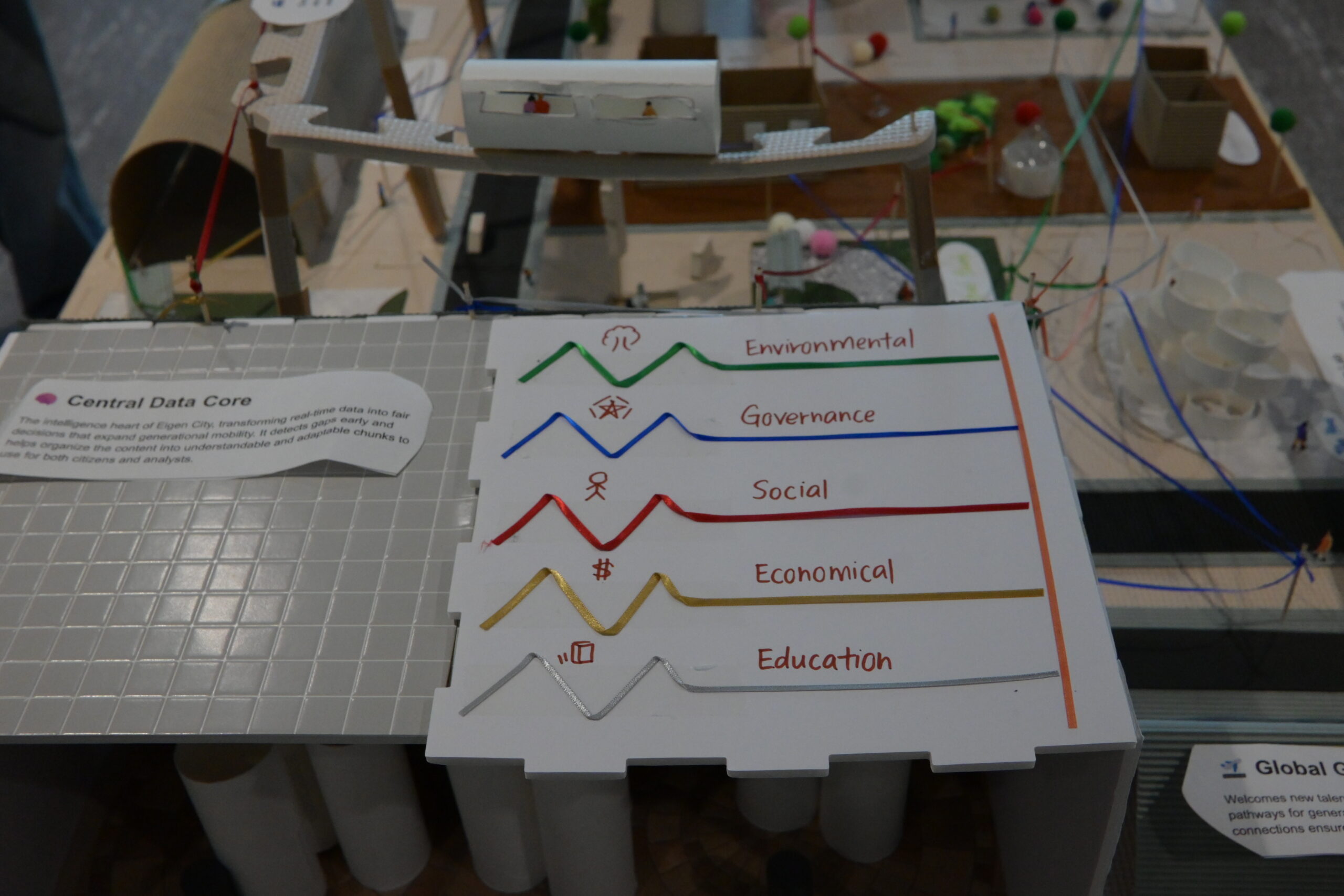 During the fieldwork, students engaged in discussions with different stakeholders to build a deeper understanding about technological integration. Then, each group showcased a diorama of their future city, highlighting possible implementations of technology in future daily life and strategies for resilient city design based on data flows and on tending to different human needs from the people living in the city.