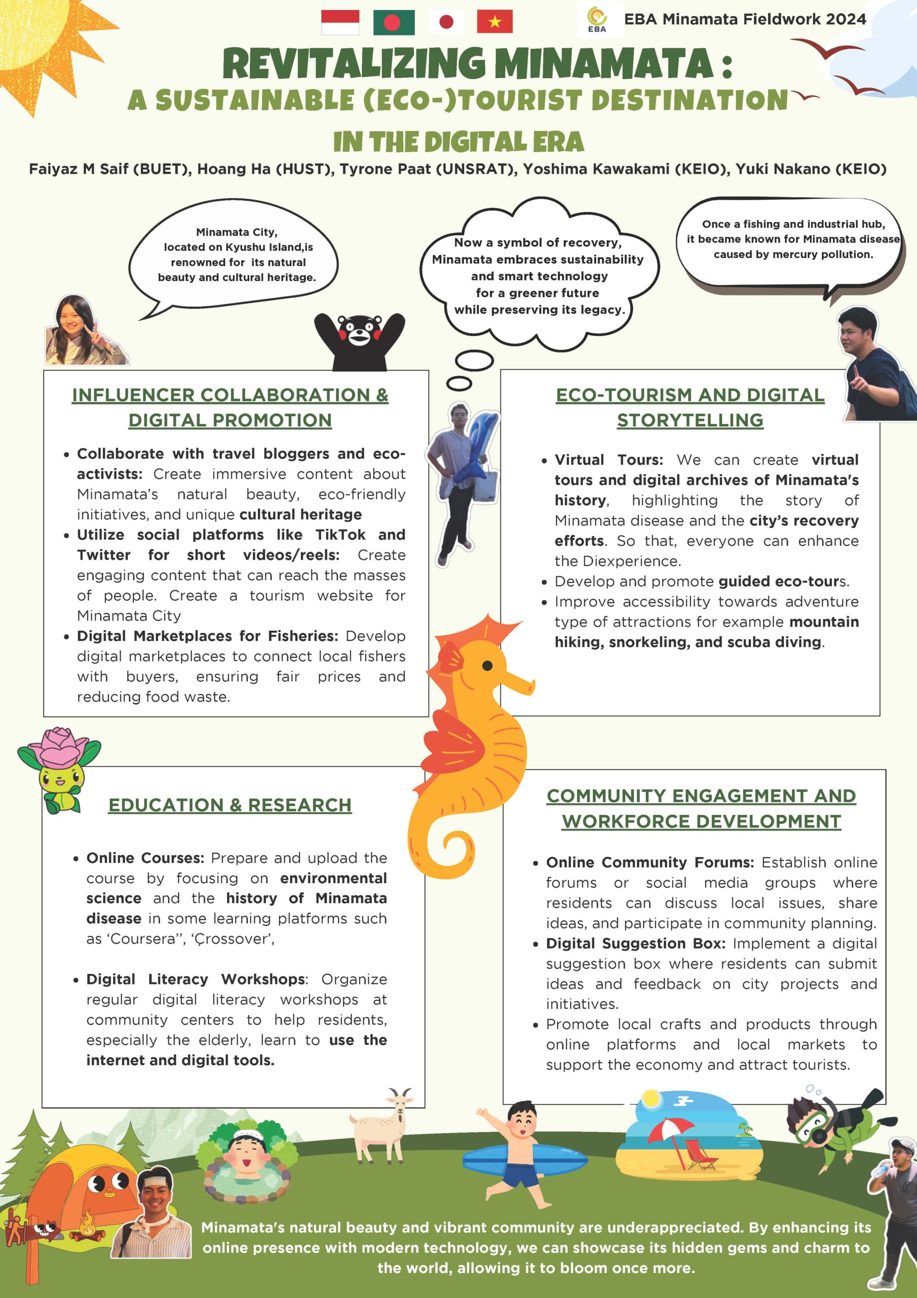 In this program, participants learned and utilized the EBA method, practicing Data Collection, Data Analyzation, Data Visualization, and Storytelling. They observed and learned about the impact of environmental pollution by exploring the field in Minamata city, located in Kyushu island, southern part of Japan. The city is known for Minamata disease, which is caused by mercury pollution from a chemical factory in 1950’s. It is the first disease caused by food chain due to environmental pollution.